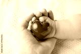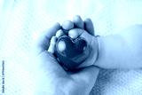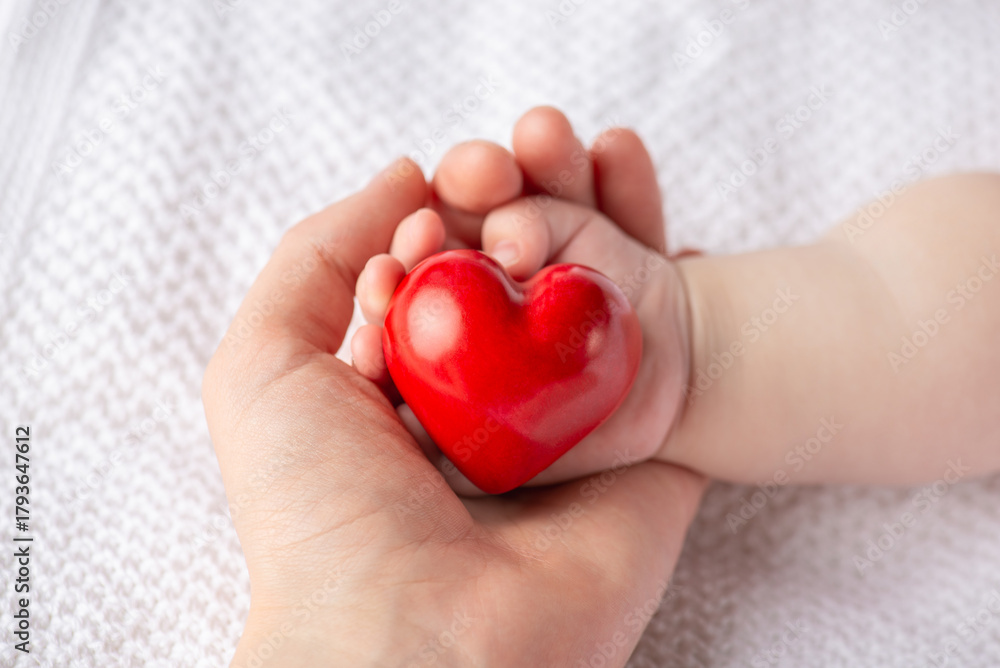 A loving moment as a parent gently holds a newborn baby's hand around a bright red heart, symbolizing care, warmth, family, and maternity in a gentle scene