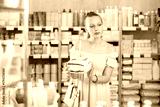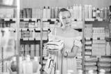 Young woman buyer chooses feminine sanitary pads in pharmacy
