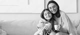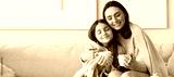 Little girl and her mother with cups of tea sitting at home