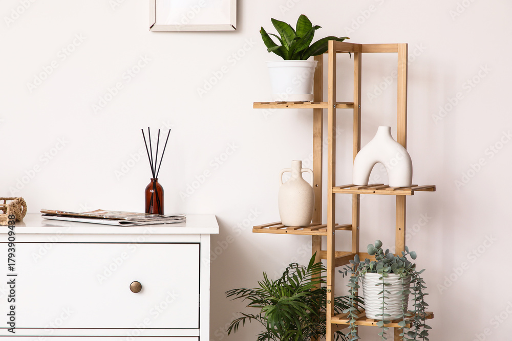Chest of drawers and shelving unit near white wall in interior of room, closeup