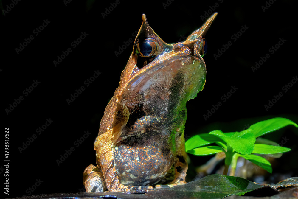 Long-nosed Horned Frog (Palaeobatrachus nasutus), also known as the Malayan Horned Frog or Malayan Leaf Frog at night in Kubah National Park, Sarawak, Borneo, Malaysia