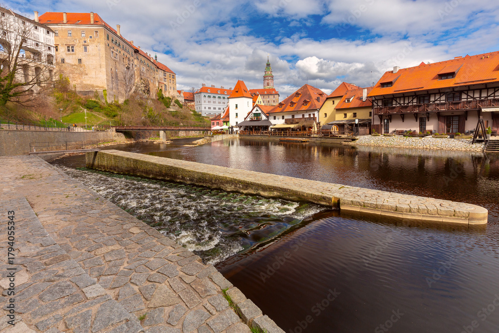 Riverfront with historic buildings, Cesky Krumlov, Czech Republic