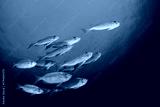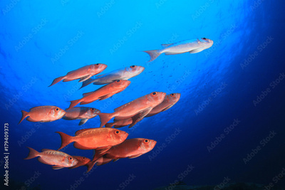 Fish school in ocean. Snapper fish on coral reef
