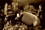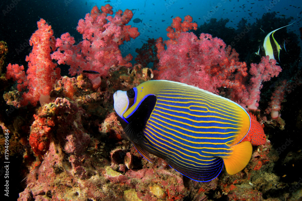 Emperor Angelfish and Moorish Idol fish on coral reef underwater