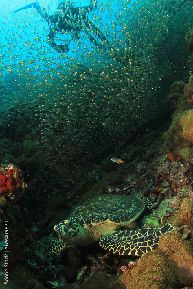 Sea Turtle underwater on coral reef