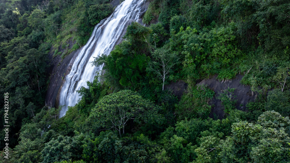Aerial view of waterfall surrounded by lush jungle and rocks, Waterfall and forest green tree, Waterfall in deep jungle with forest tree.