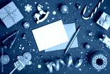 New Year and Christmas holiday decoration objects on red background with blank white paper sheet space in center