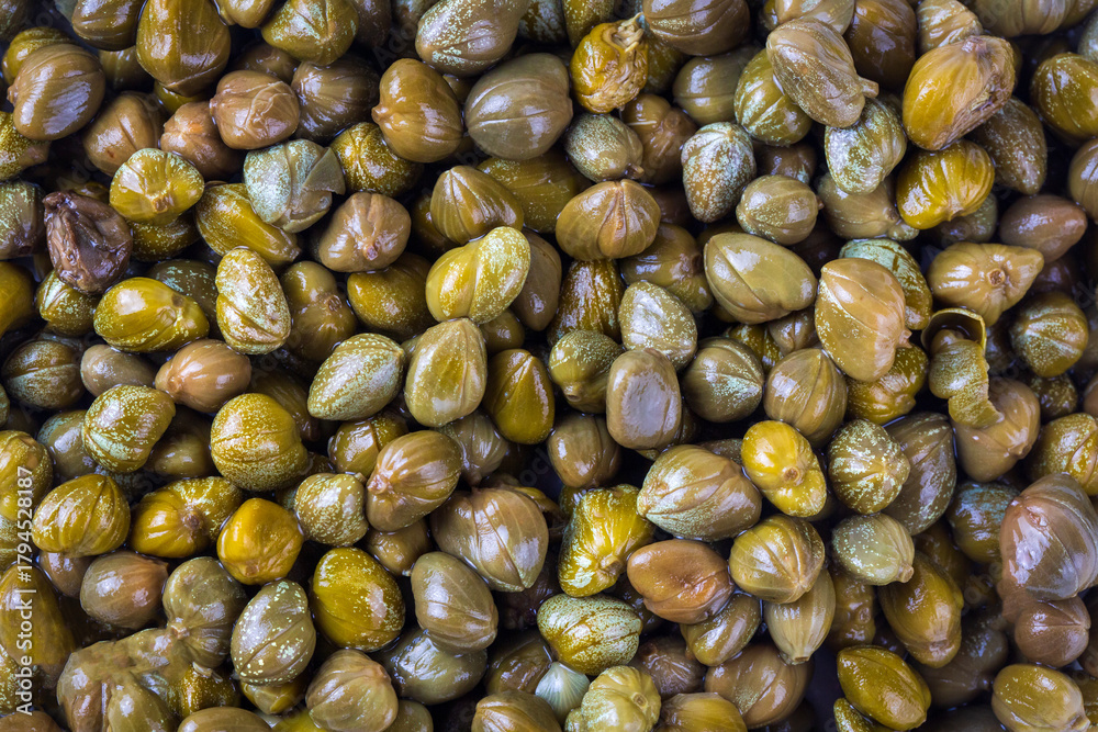 Marinated caper buds, small salted capparis in bowl, fermented food, pickled capers