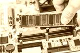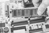 Computer technician installing computer memory RAM in the slot of the motherboard
