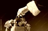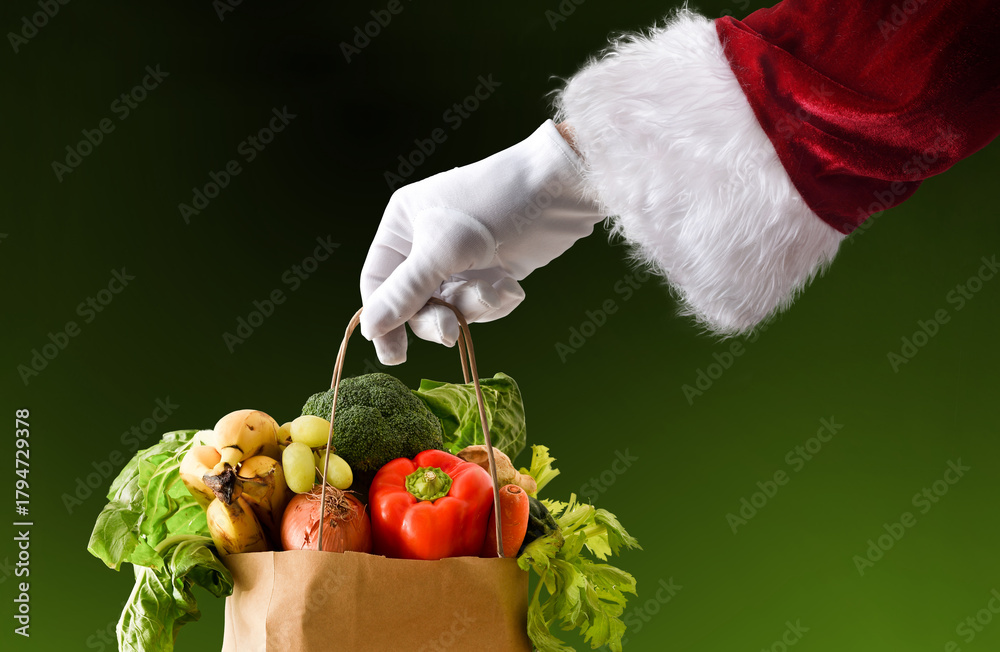 Santa's hand holding a bag full of food isolated background