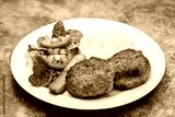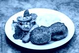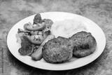 Homemade meat patties served with mashed potatoes and fresh vegetable salad.