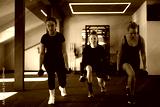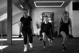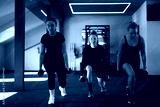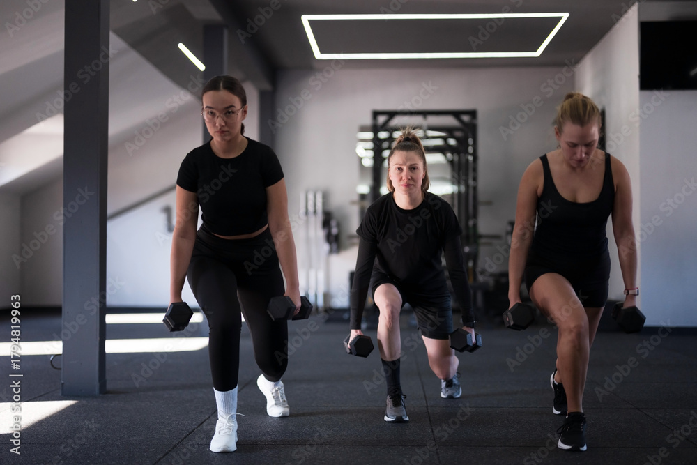 Women exercising with dumbbells in a modern gym during a fitness class focused on strength training