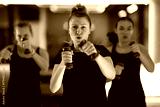 Women engaging in a fitness class using dumbbells in a modern gym setting during an evening workout session