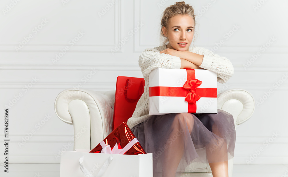 Attractive cheerful girl with great gift on her knees. Blonde hair beautiful woman sits in white armchair with present in her hands. Smiling young woman portrait hold gift in christmas color style.