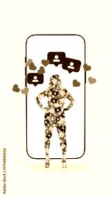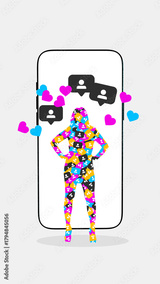 Creative digital artwork of silhouette filled with social icons standing in front of giant smartphone. Concept of digital identity, online persona, social self-image, and algorithm-shaped identity.