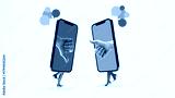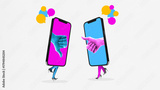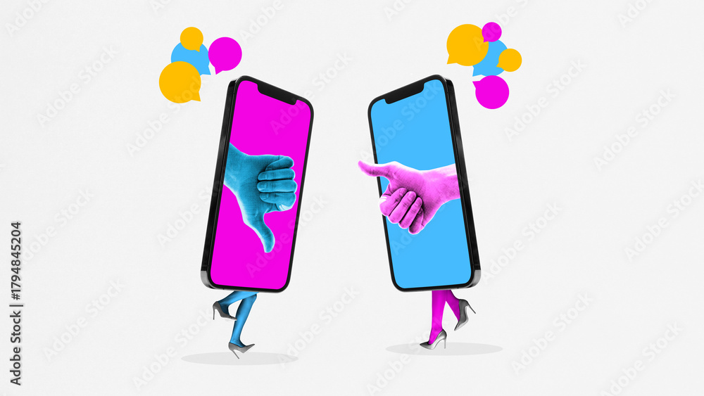 Vibrant artwork of two walking smartphones giving opposing thumbs signals with chat bubbles. Concept of online disagreement, digital debate, contrasting opinions, and communication friction.