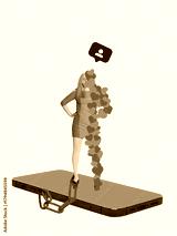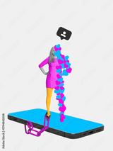 Minimal collage of woman standing on smartphone with hearts streaming from screen and ankle chain. Concept of emotional dependence, digital approval cycle, online attachment, and validation addiction.