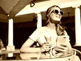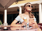 Young beautiful smiling woman holding smartphone, using apps. Sexy carefree model sitting in terrace cafe. Positive blond female eating tasty ice cream in waffles cone in sunglasses. With phone