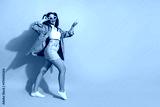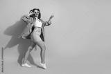 Young woman dancing in a pink studio wearing denim jacket shorts white top sneakers smiling and posing for a vibrant lifestyle fashion promo