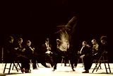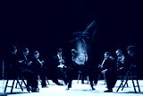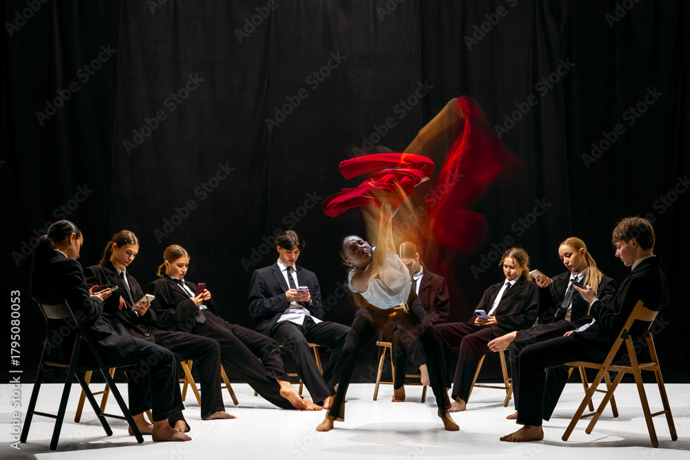 Blurred artistic spin of performer lifting red fabric while colleagues remain absorbed in their phones. Concept of emotional expression, kinetic abstraction, visual poetry and modern artistic motion.