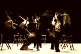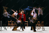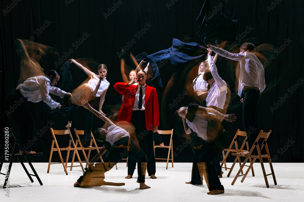 Ensemble with motion-blur performing expressive movements around still central figure in red jacket. Concept of emotional theatre, expressive movement language, dynamics and artistic storytelling.