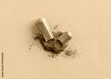 Opened Medical capsule to show brown powder on grey top view. Alternative dietary supplements