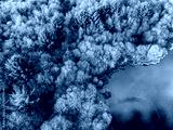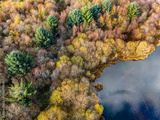 Aerial drone view of a colorful autumn forest with vibrant yellow and green trees in Wales