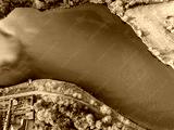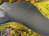 Aerial drone view of a reservoir in Ebbw Vale, South Wales, with autumn trees and fields