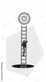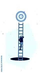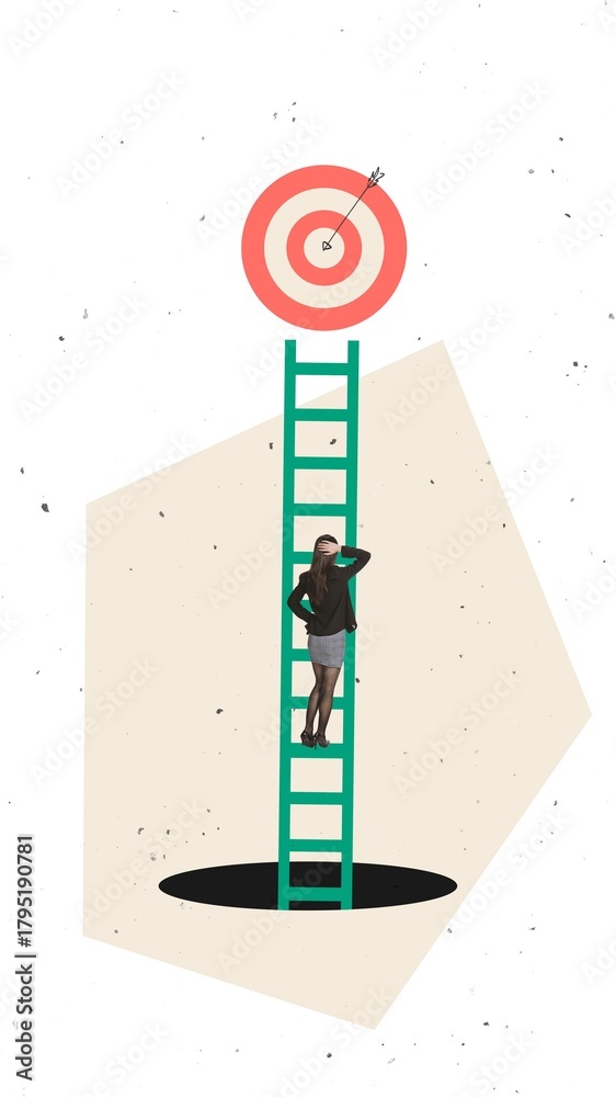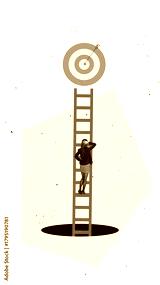 Conceptual poster showing a woman climbing a tall ladder toward a bullseye hanging above a dark pit. Concept of ambition, career risk, and goal-oriented decision-making.