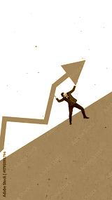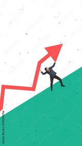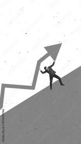 Dynamic collage showing a businessman raising a red arrow while standing on a steep diagonal surface. Concept of momentum, growth pressure, and pushing performance upward.