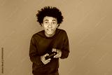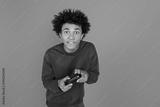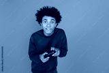 Young man with curly hair in a red sweater plays a game controller against teal background and looks surprised