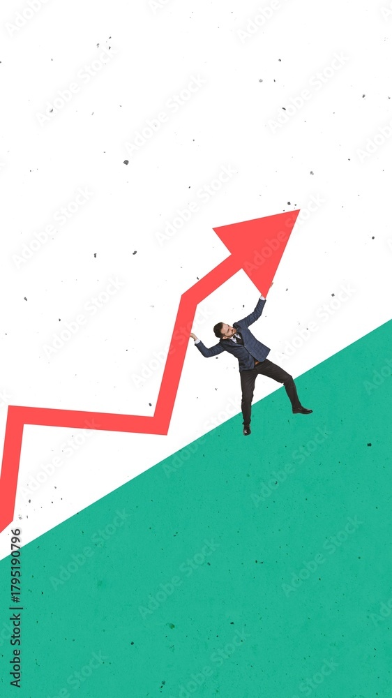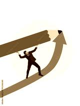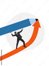 Creative artwork showing a businessman lifting a huge pencil-shaped arrow rising upward. Concept of growth, personal contribution, creative drive and shaping successful outcomes.