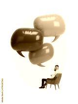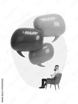 Playful artwork showing a businessman observing oversized shiny speech bubbles. Concept of communication overload, digital noise, decision pressure, attention focus, and modern dialogue.