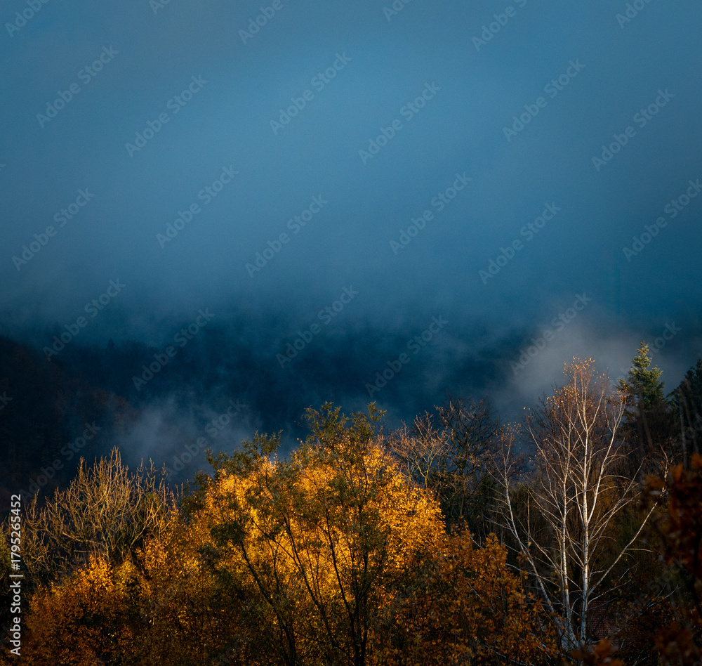 Autumn morning landscape photo wallpaper, colorful forest in the light of the rising sun