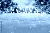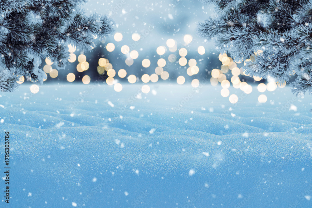 Magical Christmas Scene: Sparkling winter background featuring fresh snowdrifts and frosted pine branches, illuminated by warm, blurred golden string lights bokeh. snowfall creates holiday atmosphere