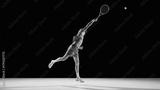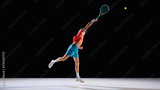 Male tennis player stretching arm to hit ball in midair with full focus. Concept of education visuals, focus training, achieving goals, youth motivation, and personal development imagery.