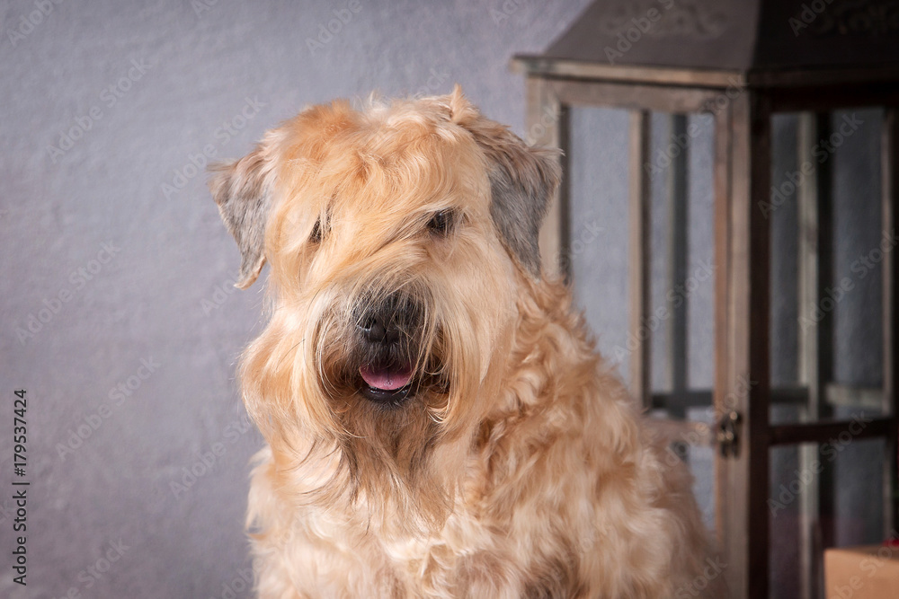 Dog. Irish soft coated wheaten terrier on Christmas background