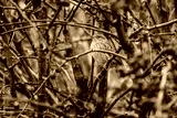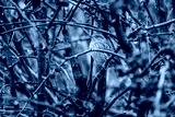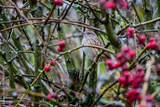 Side view of a small Dunnock in the middle of a tree laden with red berries on a wet day in Wiltshire, UK, in November 2025