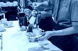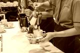 Blurred for Background.The waitress filed a glass of white coffee with the sausage between the brake and the brake food background.