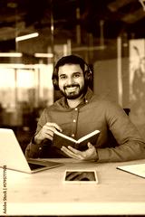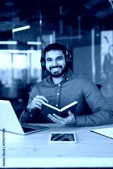 Indian man working on a laptop at a desk, smiling with headphones, holding a notebook, and engaging in online education or professional development in a modern office environment