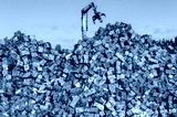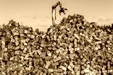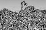 A Long-reach Excavation Grabber reaches for scrap metal cubes in a scrap yard