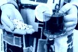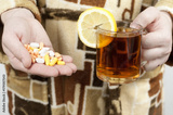 a man in a dressing gown holds a handful of pills and a hot tea with a lemon. concept: illness, cold