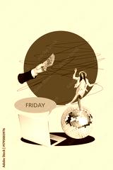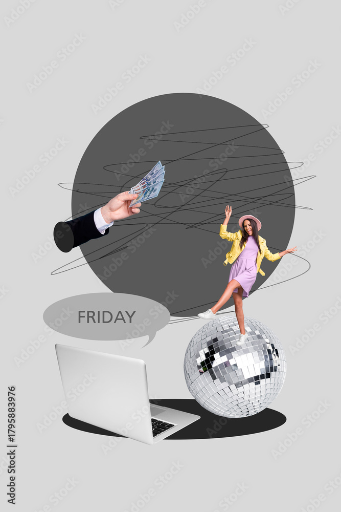 Banner 3d art pop image collage of happy girl guy stand laptop disco ball friday mood celebration occasion relax weekend event