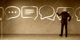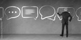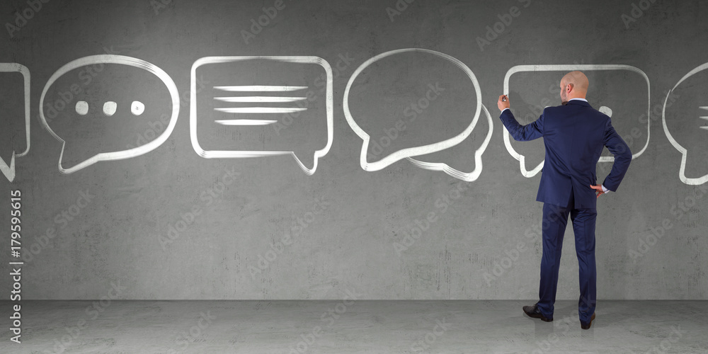 Businessman drawing discussion icons sketch on a wall 3D rendering