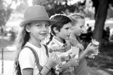 Close-up portrait of three happy preteen children walking on the street, having fun and eating ice-cream