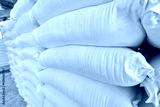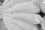 Flour sack storage facility with neatly packed sacks arranged for easy access and inventory management in a commercial setting