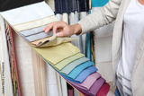 Young woman choosing fabric for new curtains in shop
