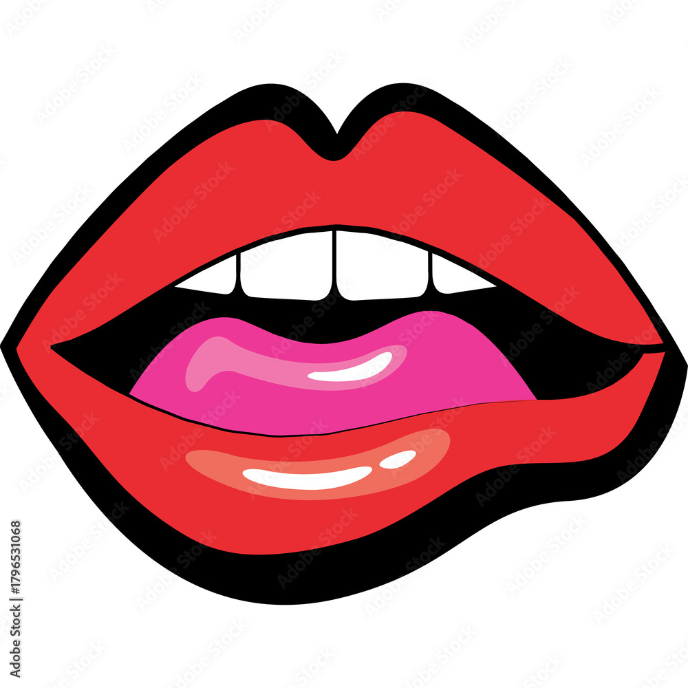 Graphic illustration of red lips with pink tongue and white teeth open in a playful expression against a transparent background detailed pop art style