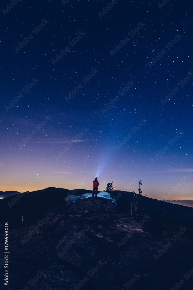 Man pointing light from his flashlight to the sky.