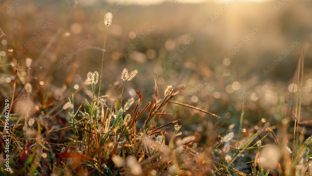 Flower field, meadow flowers in soft warm light. Autumn landscape blurry nature background.
